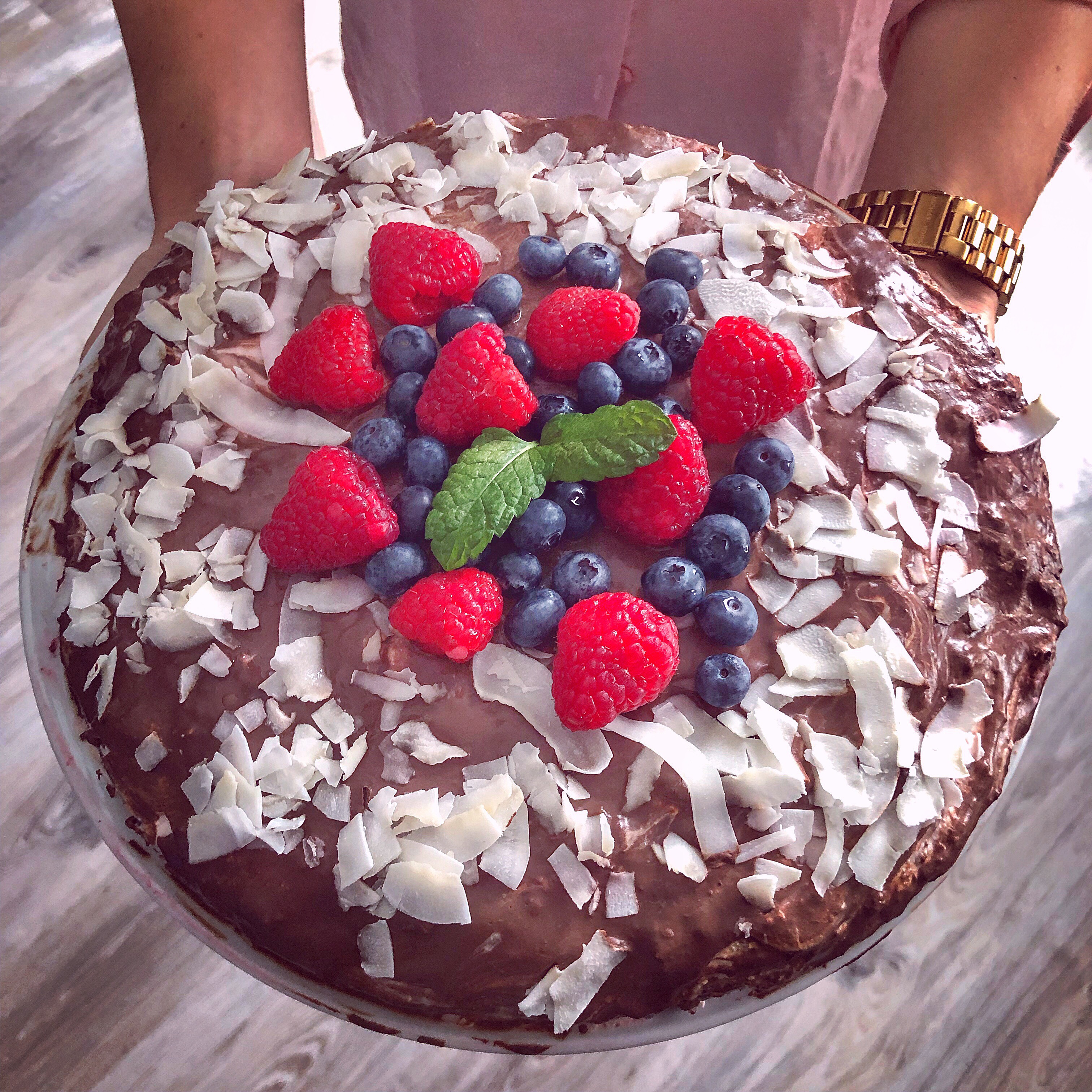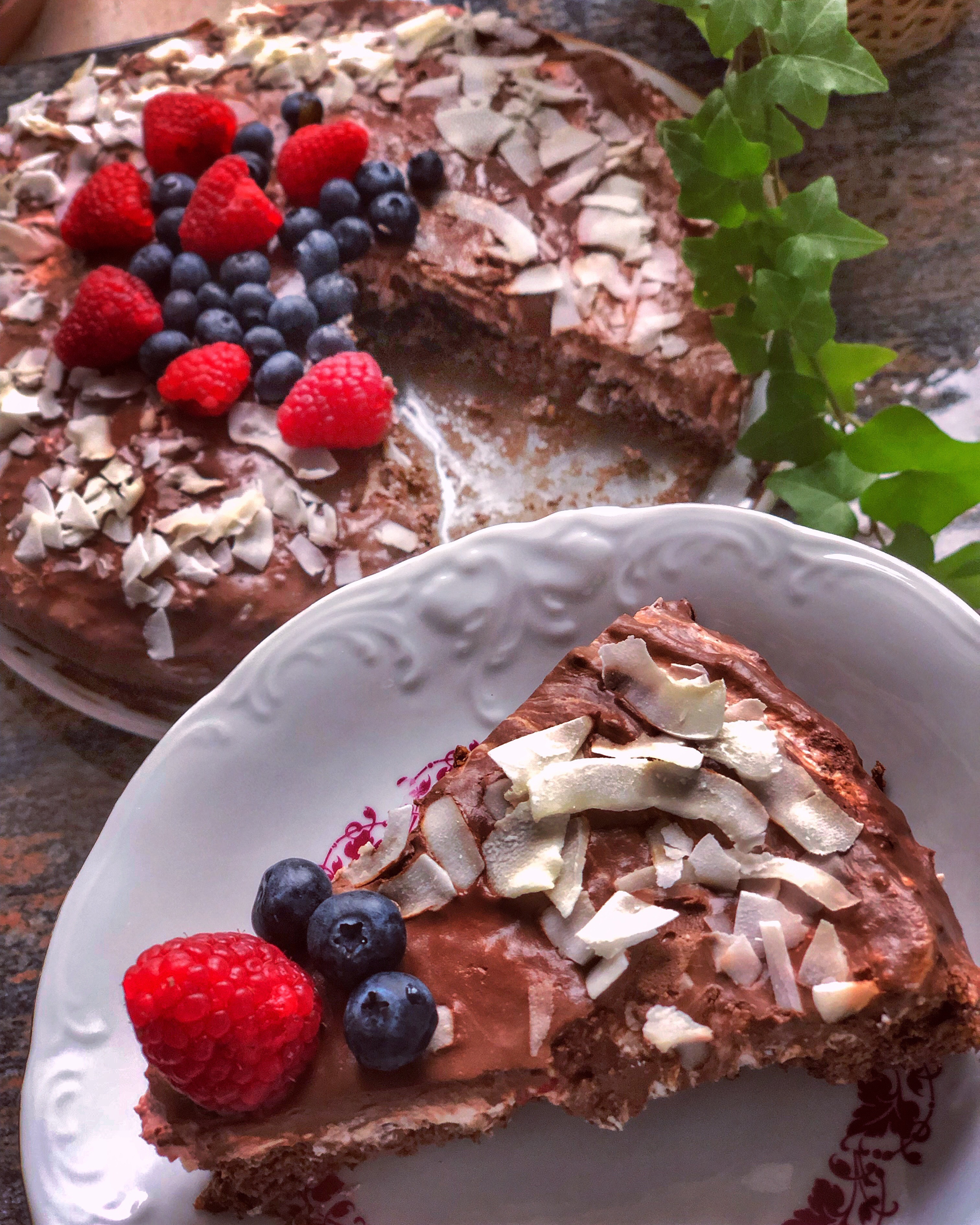 A zbývá už jen poleva. Ve vodní lázni rozpustíš 100% čokoládu . Za stálého míchání přidáš kapku mléka, trochu másla nebo oblíbenou příchuť oříškového krému . Poliješ celý dort a ozdobíš kokosem a ovocem. Nejlepší je nechat přes noc ztuhnout, ale bude stačit i hodinka v lednici.