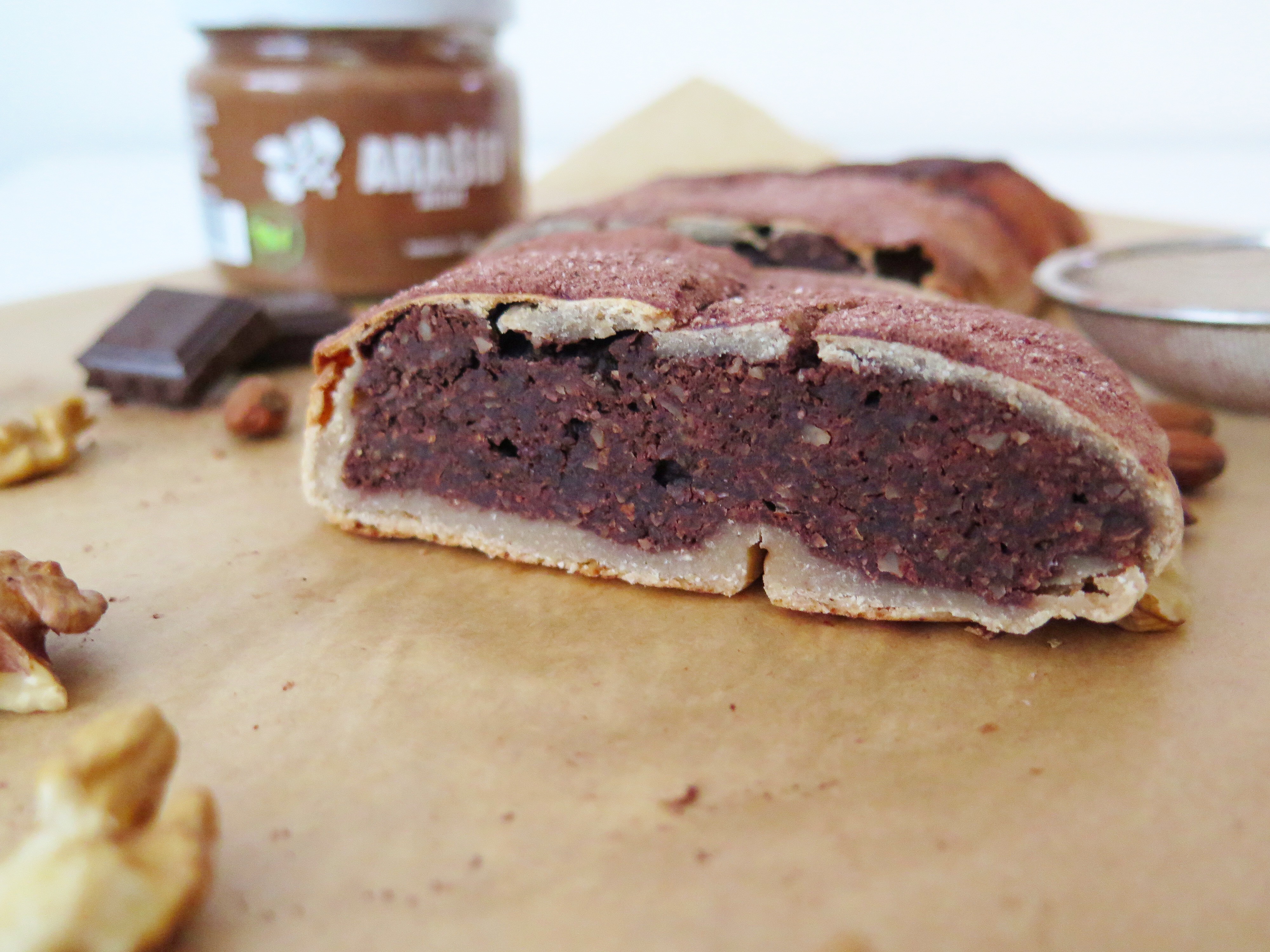 Nejdřím si vytvoříme náplň. Smícháme protein a kakao v mléku a přidáme do rozpuštěné (trochu už vychladlé) čokolády. Žloutek, kokosový olej, ořechová krém, sladidla a špetku soli vymícháme do hladka. Přidáme vychladlou čokoládovou hmotu, ořechy a promícháme. Na závěr přidáme zlehka vyšlehaný sníh z bílků. Všecny ingredience na těsto smícháme a vytverujeme do tenkého obdelníku na pečící papír (asi tak široké, aby se vám při rozprostření náplně trochu překrývalo, přibližně 20×30). Na těsto rovnoměrně položíme náplň a pomocí papíru na pečení těsto spojíme. Pokud chcete mít jistotu, že se vám těsto nerozjede natřete konce a přehyb žloutkem. Nebo těsto pořádně zarolujte pod závin. Snad se vám vše povede a pochutnáte si tak jako my :)
