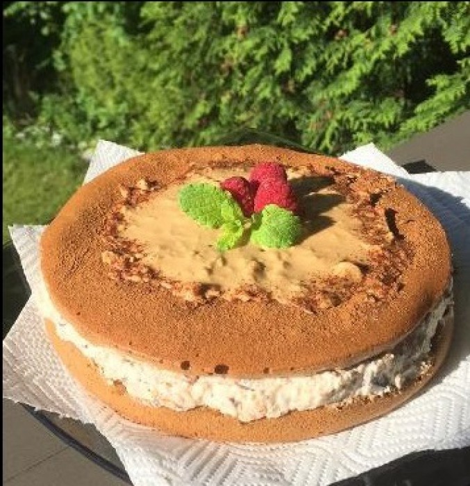 Těsto jsem nalila do silikonové formy a dala péct do předem vyhřáté trouby. Pečeme při teplotě 200 stupňů cca 12 minut a pak jsem snížila na 180 stupňů a dopekla dokud nebylo těsto uvnitř hotovo. Upečené těsto necháme vychladnout a překrojíme na polovinu.