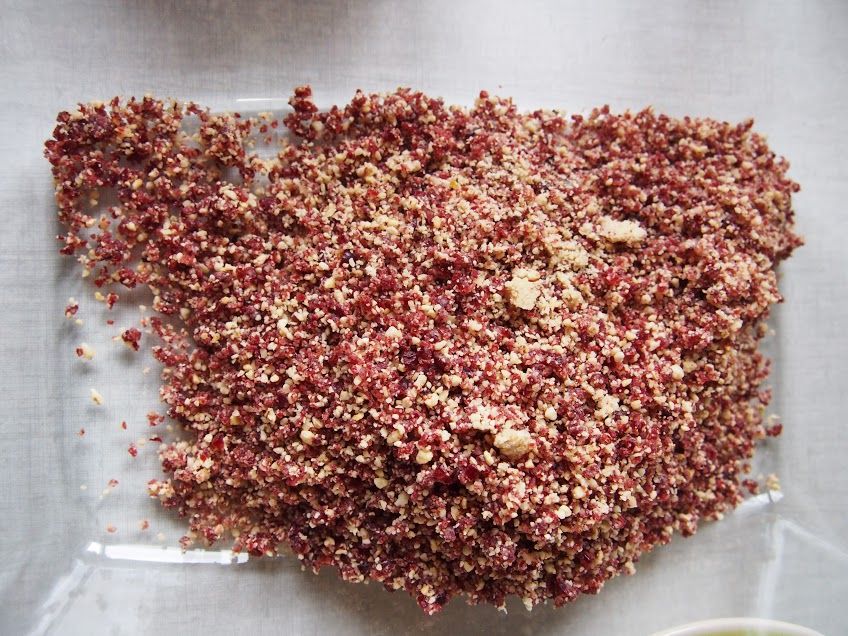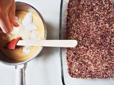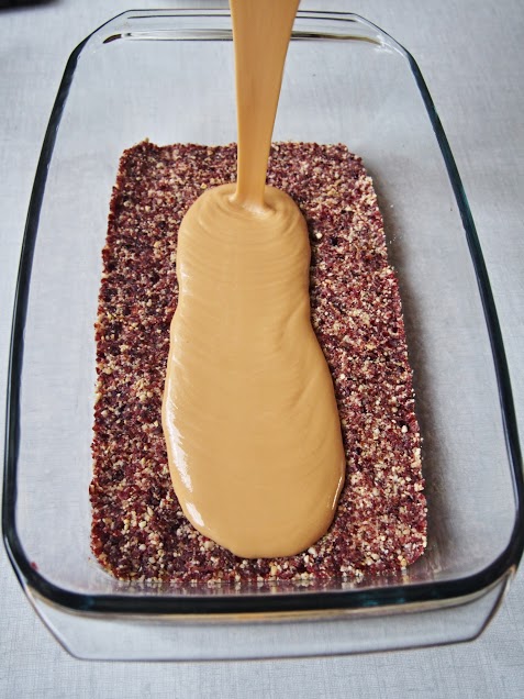 1. Spodní vrstva vznikne z mixu ořechů, ovoce a semínek – výběr necháme na Vás, můžete použít cokoliv. Těsto by mělo být od použitého ovoce lepkavé.