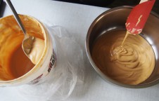 2. Do hrnce si dejte na nejslabší plamen arašídové máslo s olejem a solí, se sladidlem a postupně ohřej dokud se vše nerozpustí a nespojí, následně nalijte na spodní vrstvu a dej zamrazit na 1–2 hod.