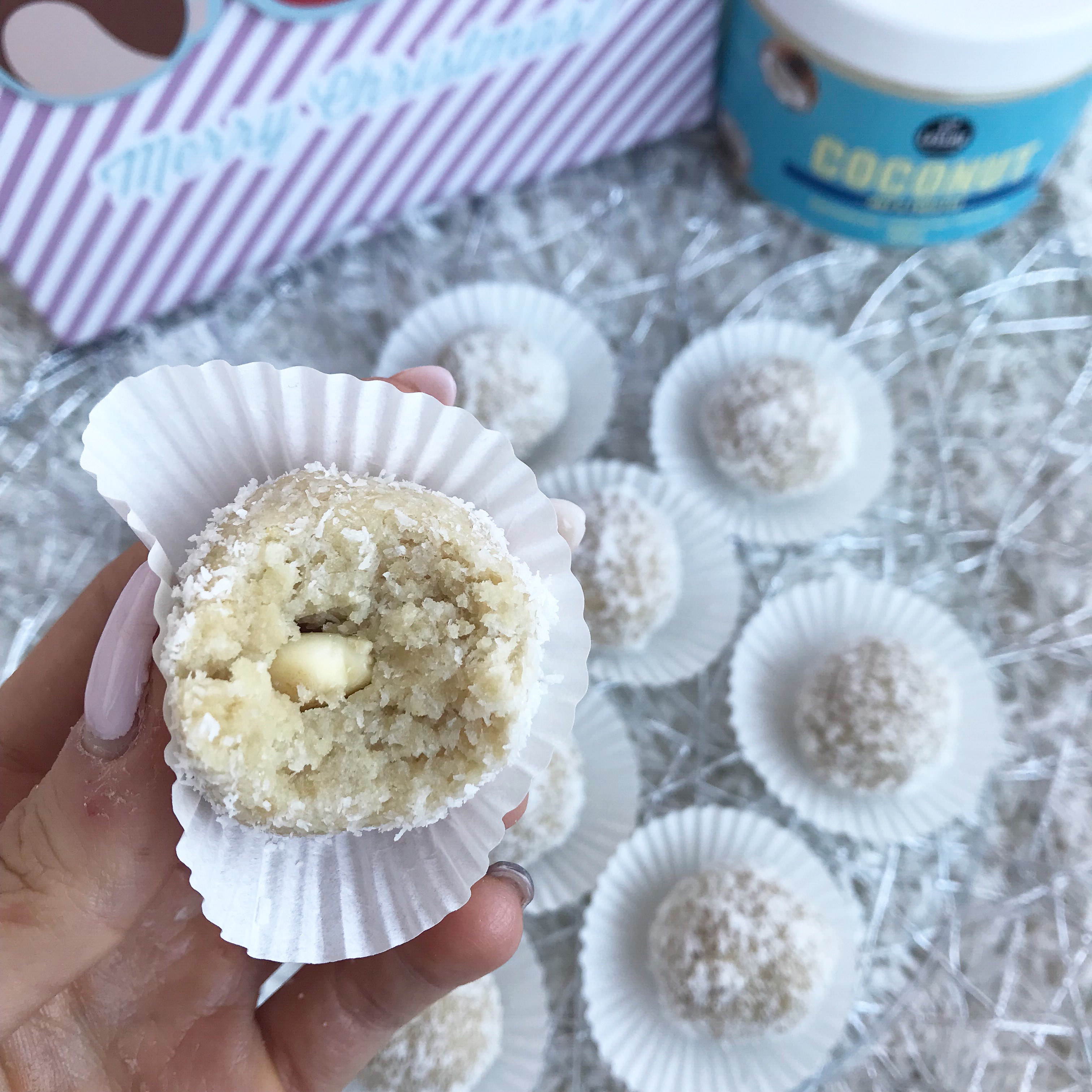 Oriešky spolu s medom zomelieme v mixéri (nie až na úplne maslo, niečo medzi). Pridáme ostatné suroviny! OKREM vanil. cukru! A už len ručne miešame pokým sa cesto nespojí. Dáme aspoň na pol hodinky do chladničky, aby sa nám lepšie pracovalo s cestom pri tvarovaní guliek. Do vnútra zapracujeme mandlu a obalíme v kokose spolu s vanilkovým cukrom.
