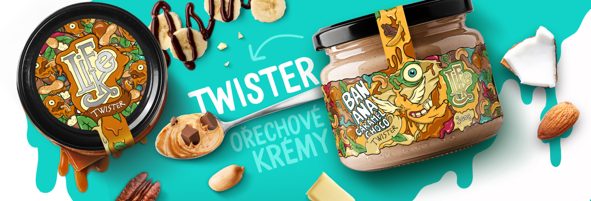 LifeLike Twister – je exklusivní ořechový krém namíchaný z těch nejkvalitnějších surovin. Ořechový krém Twister je kombinace kvalitních ořechů (vždy 80 – 90 %) a ostatních surovin , jako např. belgická tmavá nebo bílá čokoláda, ovoce, káva … Ořechové krémy vyrábíme čerstvé přímo v České republice na základě vlastní receptury.