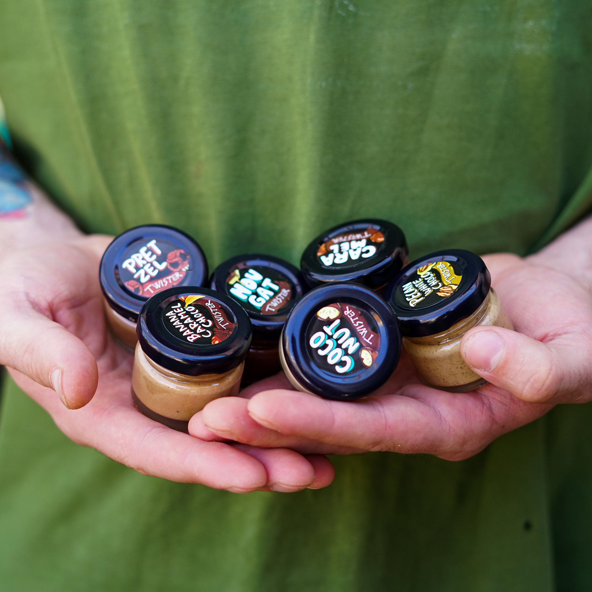 HAZELNUT NOUGAT CREAM TWISTER  (Ořechovo-nugátový krém) 30g, CARAMEL TWISTER (Arašídový krém s kakaem) 30g, BANANA CARAMEL CHOCO TWISTER (Ořechový krém s karamelovou čokoládou a banánem) 30g, COCONUT TWISTER (Kokosový krém s bílou čokoládou a sušenkami) 30g, PECAN WHITE CHOCO TWISTER (Ořechový krém s pekany a bílou čokoládou) 30g, PRETZEL TWISTER (Arašídový krém s mléčnou čokoládou a preclíky) 30g