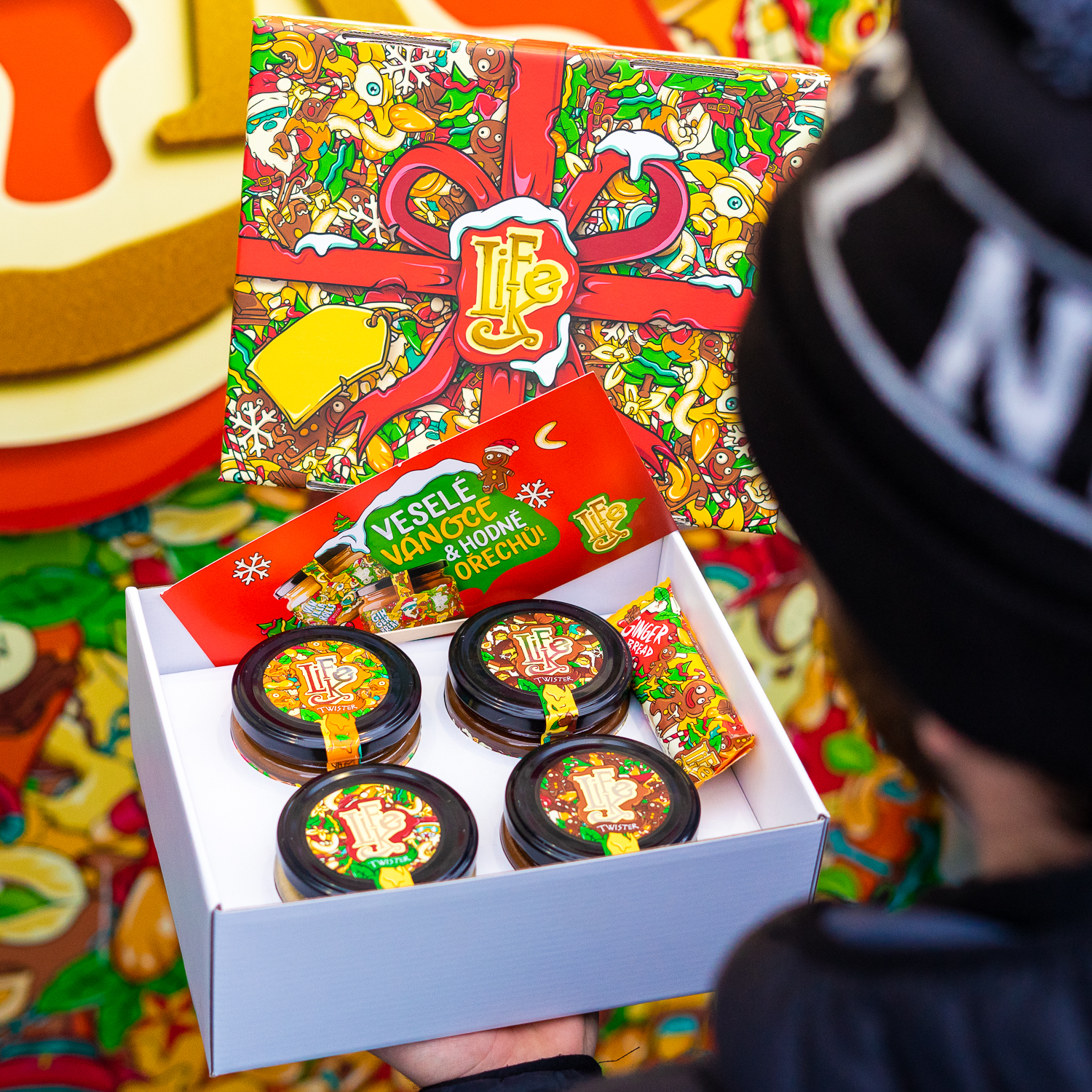 Dárková krabička LifeLike obsahuje vybrané oříškové krémy – CHRISTMAS VANILLA TWISTER, PERNÍČEK TWISTER, NOUGAT TWISTER, CARAMEL TWISTER a datlovou X-MASS tyčinku s perníkovým kořením 🤩