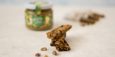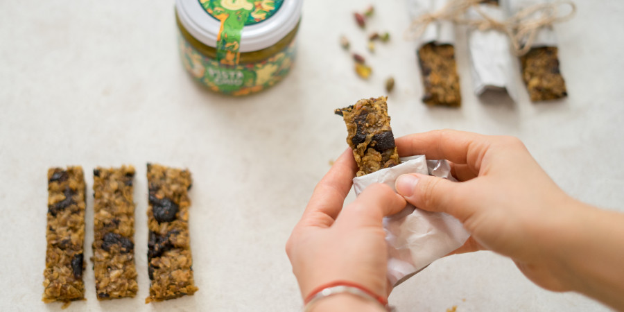 Banán rozmačkáme vydličkou a smícháme s roztopeným kokosovým olejem a pistáciovým krémem. Do směsi pomalu přidáváme pistáci, nakrájené sušené švestky, chia semínka, vločky a pomerančovou kůru. Všechno dobře promícháme aby se hmota spojila